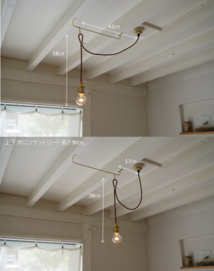 写真は、天井の電源接続箇所からフックまでの距離30cm、吊り下げ高さ38cm(電球含む)。